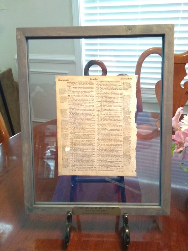 Own a piece of history with this authentic Geneva Bible page, over 375 years old! Each page is elegantly displayed in an 11″ x 14″ double-glass frame, perfect for wall mounting or tabletop display. Every piece includes a certificate of authenticity from a Bible museum and a gold 1″ x 2″ identifier plaque reading: “Original Bible Page / The Geneva Bible / Early 1600s Printing.”