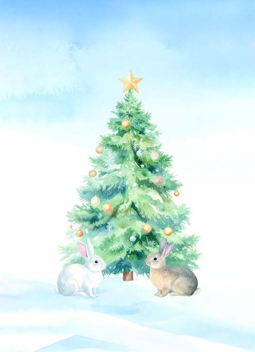 A delightful Christmas card featuring an adorable snowy scene with a festive Christmas tree and two charming bunnies, accompanied by the heartwarming message “Have Yourself a Merry Little Christmas.” Interior message: Wishing you and yours a Very Merry Christmas and a Happy New Year!